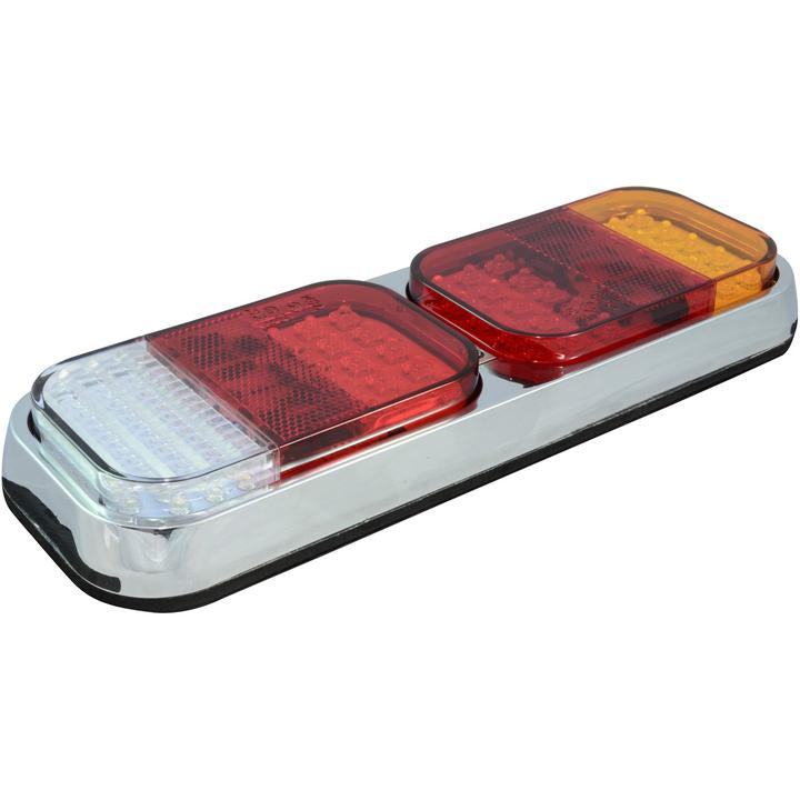 AP10474. Rear Tail Light Combination. Amber/Red/Red/White/Reflector - Stop/Tail/Indicator/Reverse/Reflector. A twin light configuration with in-built reflector housed in a chrome bracket.